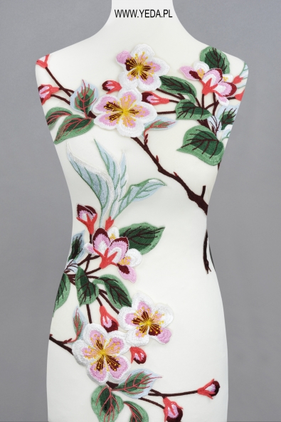 Die hochwertige Spitzenapplikation zeichnet sich durch schöne Muster aus. Es ist eine zarte und elegante Dekoration, die auf Stoff genäht ist und ihm einen einzigartigen Charakter verleiht. Die vorgestellte Applikation eignet sich perfekt als Ergänzung eines Brautkleides.