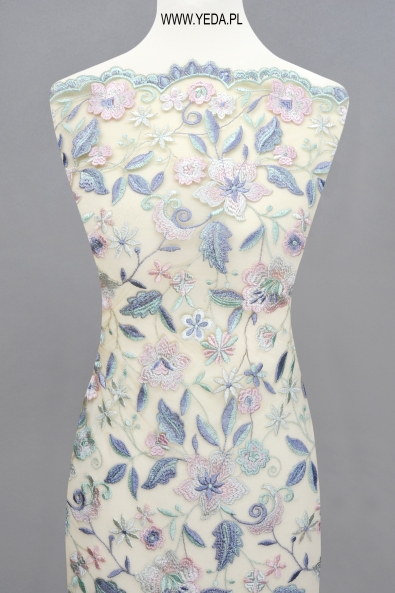Wielokolorowa koronka wyhaftowana na tiulu w kolorze cielistym.