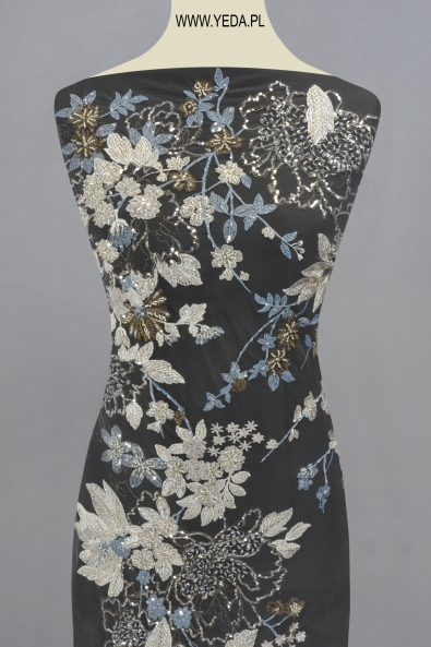 Wysokiej jakości koronka zdobiona, wyhaftowana na miękkim, lekko rozciągliwym tiulu. Elegancki i stylowy wzór przeznaczonych do sukienek koktajlowych, wieczorowych oraz wizytowych. Idealny do tworzenia olśniewających kreacji.