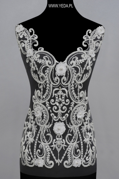 Die Applikation ist dekoriert und besteht aus eleganter Spitze und einzigartigen Accessoires, die den Aufnäher aufhellen. Das gesamte Design des Produkts ermöglicht es Ihnen, es als einzigartiges dekoratives Element in einem Abend-, Cocktail- oder Hochzeitskleid zu verwenden.