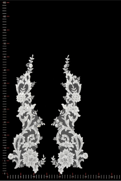 Die Applikation ist dekoriert und besteht aus eleganter Spitze und einzigartigen Accessoires, die den Aufnäher aufhellen. Das gesamte Design des Produkts ermöglicht es Ihnen, es als einzigartiges dekoratives Element in einem Abend-, Cocktail- oder Hochzeitskleid zu verwenden.