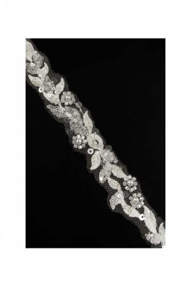 Hochwertig dekoriertes Band aus äußerst eleganter Spitze. Es begeistert mit schönen Mustern und Accessoires, die den Charme des damit verzierten Stoffes unterstreichen. Es ist der perfekte Abschluss für jedes Hochzeit-, Abend- oder jedes Cocktailkleid. Dieses unscheinbare Detail fällt auf und ruft Bewunderung hervor.