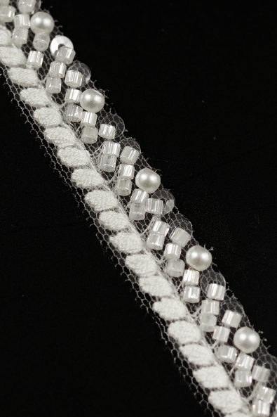 Hochwertig dekoriertes Band aus äußerst eleganter Spitze. Es begeistert mit schönen Mustern und Accessoires, die den Charme des damit verzierten Stoffes unterstreichen. Es ist der perfekte Abschluss für jedes Hochzeit-, Abend- oder jedes Cocktailkleid. Dieses unscheinbare Detail fällt auf und ruft Bewunderung hervor.