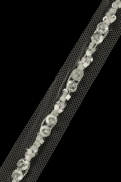 Hochwertig dekoriertes Band aus äußerst eleganter Spitze. Es begeistert mit schönen Mustern und Accessoires, die den Charme des damit verzierten Stoffes unterstreichen. Es ist der perfekte Abschluss für jedes Hochzeit-, Abend- oder jedes Cocktailkleid. Dieses unscheinbare Detail fällt auf und ruft Bewunderung hervor.