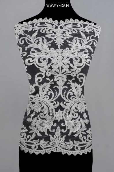 Hochwertig dekoriertes Band aus äußerst eleganter Spitze. Es begeistert mit schönen Mustern und Accessoires, die den Charme des damit verzierten Stoffes unterstreichen. Es ist der perfekte Abschluss für jedes Hochzeit-, Abend- oder jedes Cocktailkleid. Dieses unscheinbare Detail fällt auf und ruft Bewunderung hervor.