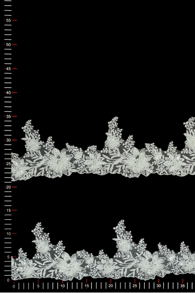 Hochwertig dekoriertes Band aus äußerst eleganter Spitze. Es begeistert mit schönen Mustern und Accessoires, die den Charme des damit verzierten Stoffes unterstreichen. Es ist der perfekte Abschluss für jedes Hochzeit-, Abend- oder jedes Cocktailkleid. Dieses unscheinbare Detail fällt auf und ruft Bewunderung hervor.