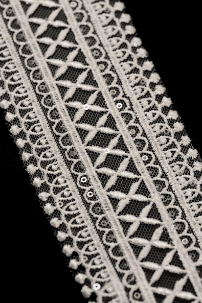 Hochwertig dekoriertes Band aus äußerst eleganter Spitze. Es begeistert mit schönen Mustern und Accessoires, die den Charme des damit verzierten Stoffes unterstreichen. Es ist der perfekte Abschluss für jedes Hochzeit-, Abend- oder jedes Cocktailkleid. Dieses unscheinbare Detail fällt auf und ruft Bewunderung hervor.