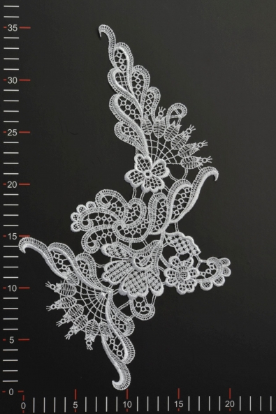 Hochwertige, unverzierte Applikation aus Gipüre. Es zeichnet sich durch eine solide Fertigung, klare Form und breite Spitzenmaschen aus. Auf ein Hochzeits-, Abend- oder Cocktailkleid genäht, verleiht es ihm einen individuellen und einzigartigen Charakter.