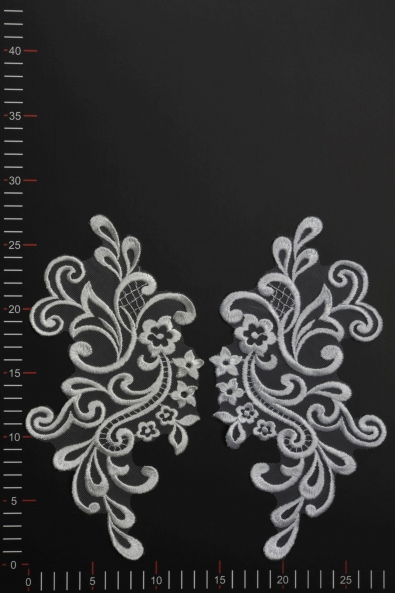Hochwertige, unverzierte Applikation aus Gipüre. Es zeichnet sich durch eine solide Fertigung, klare Form und breite Spitzenmaschen aus. Auf ein Hochzeits-, Abend- oder Cocktailkleid genäht, verleiht es ihm einen individuellen und einzigartigen Charakter.