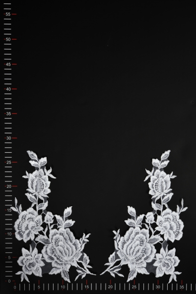 Die hochwertige Spitzenapplikation zeichnet sich durch schöne Muster aus. Es ist eine zarte und elegante Dekoration, die auf Stoff genäht ist und ihm einen einzigartigen Charakter verleiht. Die vorgestellte Applikation eignet sich perfekt als Ergänzung eines Brautkleides.