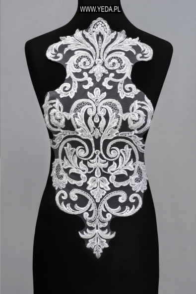 Die Applikation ist dekoriert und besteht aus eleganter Spitze und einzigartigen Accessoires, die den Aufnäher aufhellen. Das gesamte Design des Produkts ermöglicht es Ihnen, es als einzigartiges dekoratives Element in einem Abend-, Cocktail- oder Hochzeitskleid zu verwenden.