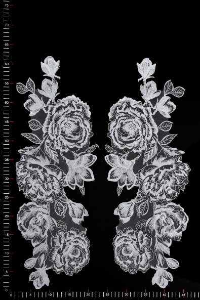 Die hochwertige Spitzenapplikation zeichnet sich durch schöne Muster aus. Es ist eine zarte und elegante Dekoration, die auf Stoff genäht ist und ihm einen einzigartigen Charakter verleiht. Die vorgestellte Applikation eignet sich perfekt als Ergänzung eines Brautkleides.