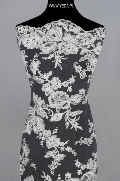Verzierte Spitze von hoher Qualität, die sich durch originelles Muster und dekorative Details auszeichnet. Geschaffen mit dem Gedanken an anspruchsvollste Frauen, die auf eine einmalige und effektvolle Stilisierung Wert legen. Die vorgestellte Spitze wird sich als Basis einer Hochzeits- oder Abendkreation bewähren. Ihre Schönheit verdankt sie den darin enthaltenen Details. Sie spiegeln das Licht wider und erhellen den Stoff, wodurch sie zum Hingucker werden.