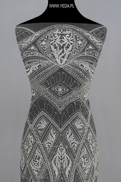 Verzierte Spitze von hoher Qualität, die sich durch originelles Muster und dekorative Details auszeichnet. Geschaffen mit dem Gedanken an anspruchsvollste Frauen, die auf eine einmalige und effektvolle Stilisierung Wert legen. Die vorgestellte Spitze wird sich als Basis einer Hochzeits- oder Abendkreation bewähren. Ihre Schönheit verdankt sie den darin enthaltenen Details. Sie spiegeln das Licht wider und erhellen den Stoff, wodurch sie zum Hingucker werden.