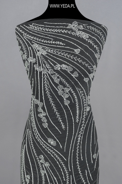 Verzierte Spitze von hoher Qualität, die sich durch originelles Muster und dekorative Details auszeichnet. Geschaffen mit dem Gedanken an anspruchsvollste Frauen, die auf eine einmalige und effektvolle Stilisierung Wert legen. Die vorgestellte Spitze wird sich als Basis einer Hochzeits- oder Abendkreation bewähren. Ihre Schönheit verdankt sie den darin enthaltenen Details. Sie spiegeln das Licht wider und erhellen den Stoff, wodurch sie zum Hingucker werden.