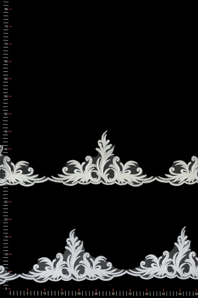 Hochwertiges Gipüre-Spitzenband, verziert mit dekorativen Accessoires. Es wurde für den effektvollen Abschluss von Hochzeitskreationen oder anderen Stoffen entwickelt. Das originelle Design fällt auf und lässt jedes Kleid umwerfend aussehen.