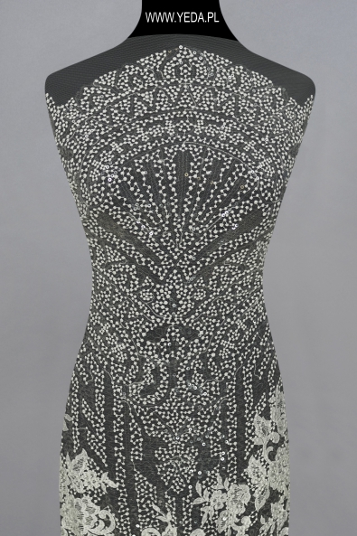 Verzierte Spitze von hoher Qualität, die sich durch originelles Muster und dekorative Details auszeichnet. Geschaffen mit dem Gedanken an anspruchsvollste Frauen, die auf eine einmalige und effektvolle Stilisierung Wert legen. Die vorgestellte Spitze wird sich als Basis einer Hochzeits- oder Abendkreation bewähren. Ihre Schönheit verdankt sie den darin enthaltenen Details. Sie spiegeln das Licht wider und erhellen den Stoff, wodurch sie zum Hingucker werden.
