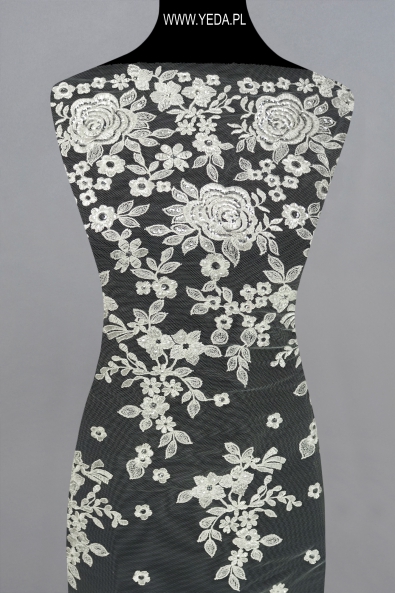 Verzierte Spitze von hoher Qualität, die sich durch originelles Muster und dekorative Details auszeichnet. Geschaffen mit dem Gedanken an anspruchsvollste Frauen, die auf eine einmalige und effektvolle Stilisierung Wert legen. Die vorgestellte Spitze wird sich als Basis einer Hochzeits- oder Abendkreation bewähren. Ihre Schönheit verdankt sie den darin enthaltenen Details. Sie spiegeln das Licht wider und erhellen den Stoff, wodurch sie zum Hingucker werden.