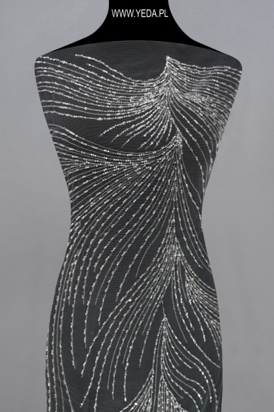 Verzierte Spitze von hoher Qualität, die sich durch originelles Muster und dekorative Details auszeichnet. Geschaffen mit dem Gedanken an anspruchsvollste Frauen, die auf eine einmalige und effektvolle Stilisierung Wert legen. Die vorgestellte Spitze wird sich als Basis einer Hochzeits- oder Abendkreation bewähren. Ihre Schönheit verdankt sie den darin enthaltenen Details. Sie spiegeln das Licht wider und erhellen den Stoff, wodurch sie zum Hingucker werden.