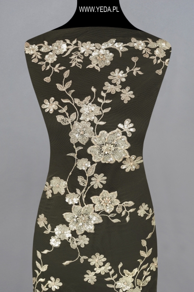 Hochwertig dekorierte Abendspitze für Frauen, die Wert auf Eleganz legen. Das einzigartige Muster wurde auf Tüll gestickt und anschließend mit spektakulären Details verziert. Diese Art von Material fällt auf und verleiht dem Benutzer einen verführerischen Charakter. Diese Art von Spitze ist die Basis eines klassischen Abend- oder Cocktailkleides.
