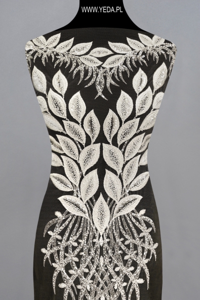 Verzierte Spitze von hoher Qualität, die sich durch originelles Muster und dekorative Details auszeichnet. Geschaffen mit dem Gedanken an anspruchsvollste Frauen, die auf eine einmalige und effektvolle Stilisierung Wert legen. Die vorgestellte Spitze wird sich als Basis einer Hochzeits- oder Abendkreation bewähren. Ihre Schönheit verdankt sie den darin enthaltenen Details. Sie spiegeln das Licht wider und erhellen den Stoff, wodurch sie zum Hingucker werden.