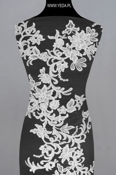 Verzierte Spitze von hoher Qualität, die sich durch originelles Muster und dekorative Details auszeichnet. Geschaffen mit dem Gedanken an anspruchsvollste Frauen, die auf eine einmalige und effektvolle Stilisierung Wert legen. Die vorgestellte Spitze wird sich als Basis einer Hochzeits- oder Abendkreation bewähren. Ihre Schönheit verdankt sie den darin enthaltenen Details. Sie spiegeln das Licht wider und erhellen den Stoff, wodurch sie zum Hingucker werden.
