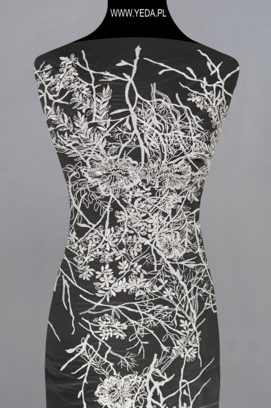 Verzierte Spitze von hoher Qualität, die sich durch originelles Muster und dekorative Details auszeichnet. Geschaffen mit dem Gedanken an anspruchsvollste Frauen, die auf eine einmalige und effektvolle Stilisierung Wert legen. Die vorgestellte Spitze wird sich als Basis einer Hochzeits- oder Abendkreation bewähren. Ihre Schönheit verdankt sie den darin enthaltenen Details. Sie spiegeln das Licht wider und erhellen den Stoff, wodurch sie zum Hingucker werden.