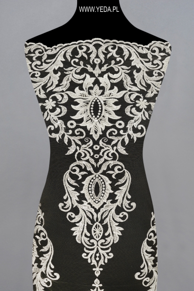 Verzierte Spitze von hoher Qualität, die sich durch originelles Muster und dekorative Details auszeichnet. Geschaffen mit dem Gedanken an anspruchsvollste Frauen, die auf eine einmalige und effektvolle Stilisierung Wert legen. Die vorgestellte Spitze wird sich als Basis einer Hochzeits- oder Abendkreation bewähren. Ihre Schönheit verdankt sie den darin enthaltenen Details. Sie spiegeln das Licht wider und erhellen den Stoff, wodurch sie zum Hingucker werden.