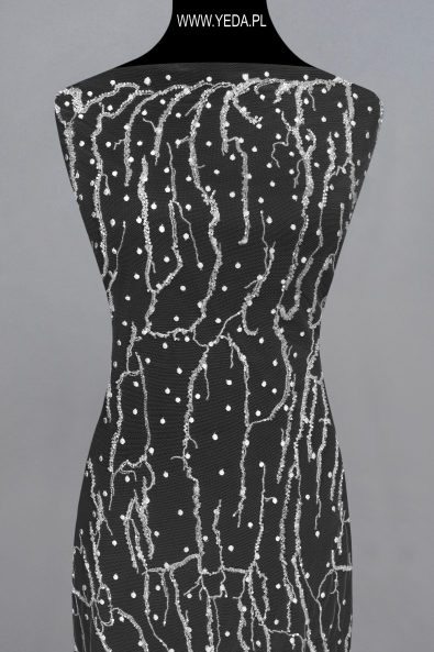 Verzierte Spitze von hoher Qualität, die sich durch originelles Muster und dekorative Details auszeichnet. Geschaffen mit dem Gedanken an anspruchsvollste Frauen, die auf eine einmalige und effektvolle Stilisierung Wert legen. Die vorgestellte Spitze wird sich als Basis einer Hochzeits- oder Abendkreation bewähren. Ihre Schönheit verdankt sie den darin enthaltenen Details. Sie spiegeln das Licht wider und erhellen den Stoff, wodurch sie zum Hingucker werden.