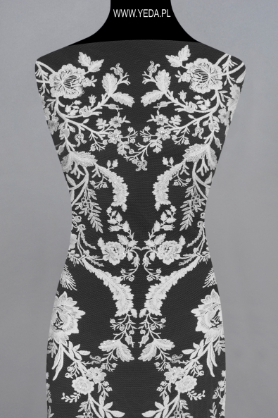 Verzierte Spitze von hoher Qualität, die sich durch originelles Muster und dekorative Details auszeichnet. Geschaffen mit dem Gedanken an anspruchsvollste Frauen, die auf eine einmalige und effektvolle Stilisierung Wert legen. Die vorgestellte Spitze wird sich als Basis einer Hochzeits- oder Abendkreation bewähren. Ihre Schönheit verdankt sie den darin enthaltenen Details. Sie spiegeln das Licht wider und erhellen den Stoff, wodurch sie zum Hingucker werden.
