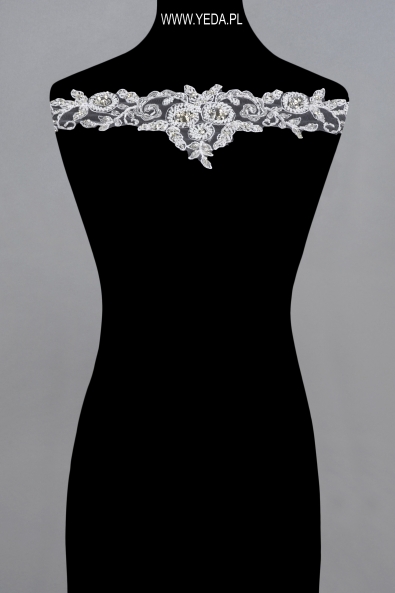 Die Applikation ist dekoriert und besteht aus eleganter Spitze und einzigartigen Accessoires, die den Aufnäher aufhellen. Das gesamte Design des Produkts ermöglicht es Ihnen, es als einzigartiges dekoratives Element in einem Abend-, Cocktail- oder Hochzeitskleid zu verwenden.