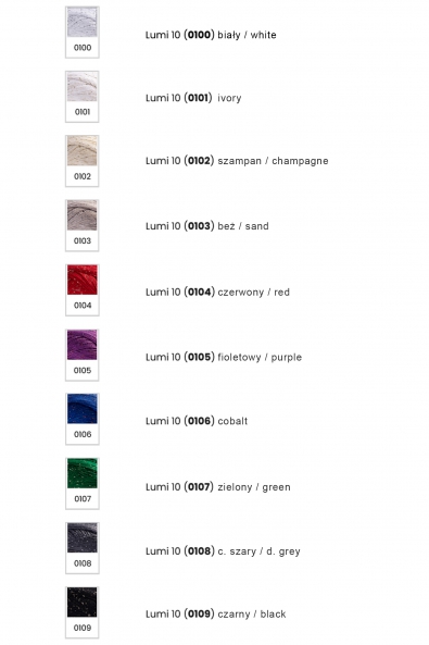 LUMI ist ein Häkelgarn, das Baumwolle mit einem metallisierten Faden kombiniert, der je nach Farbe des Garns silbern, golden oder mehrfarbig ist. Es ist für verschiedene Arten von Arbeiten gedacht, bei denen der dekorative Charakter des Fadens hilft, einen außergewöhnlichen Effekt zu erzielen. Das LUMI Häkelgarn bietet viele Möglichkeiten in fast jeder Handarbeitstechnik.