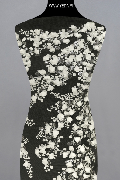 Verzierte Spitze von hoher Qualität, die sich durch originelles Muster und dekorative Details auszeichnet. Geschaffen mit dem Gedanken an anspruchsvollste Frauen, die auf eine einmalige und effektvolle Stilisierung Wert legen. Die vorgestellte Spitze wird sich als Basis einer Hochzeits- oder Abendkreation bewähren. Ihre Schönheit verdankt sie den darin enthaltenen Details. Sie spiegeln das Licht wider und erhellen den Stoff, wodurch sie zum Hingucker werden.