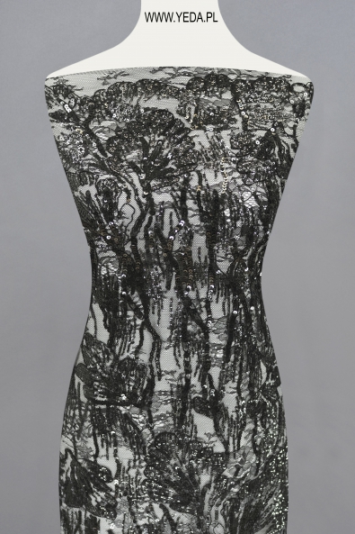 Hochwertig dekorierte Abendspitze für Frauen, die Wert auf Eleganz legen. Das einzigartige Muster wurde auf Tüll gestickt und anschließend mit spektakulären Details verziert. Diese Art von Material fällt auf und verleiht dem Benutzer einen verführerischen Charakter. Diese Art von Spitze ist die Basis eines klassischen Abend- oder Cocktailkleides.