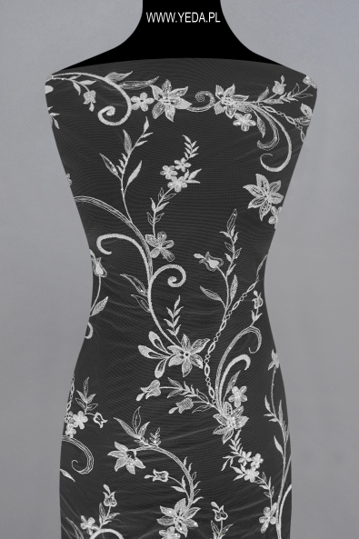 Verzierte Spitze von hoher Qualität, die sich durch originelles Muster und dekorative Details auszeichnet. Geschaffen mit dem Gedanken an anspruchsvollste Frauen, die auf eine einmalige und effektvolle Stilisierung Wert legen. Die vorgestellte Spitze wird sich als Basis einer Hochzeits- oder Abendkreation bewähren. Ihre Schönheit verdankt sie den darin enthaltenen Details. Sie spiegeln das Licht wider und erhellen den Stoff, wodurch sie zum Hingucker werden.