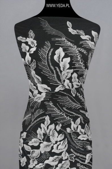 Verzierte Spitze von hoher Qualität, die sich durch originelles Muster und dekorative Details auszeichnet. Geschaffen mit dem Gedanken an anspruchsvollste Frauen, die auf eine einmalige und effektvolle Stilisierung Wert legen. Die vorgestellte Spitze wird sich als Basis einer Hochzeits- oder Abendkreation bewähren. Ihre Schönheit verdankt sie den darin enthaltenen Details. Sie spiegeln das Licht wider und erhellen den Stoff, wodurch sie zum Hingucker werden.