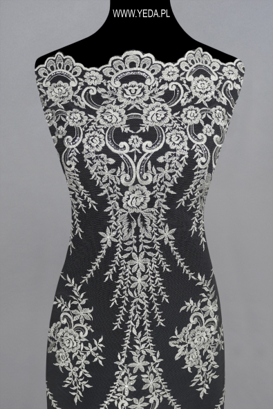 Verzierte Spitze von hoher Qualität, die sich durch originelles Muster und dekorative Details auszeichnet. Geschaffen mit dem Gedanken an anspruchsvollste Frauen, die auf eine einmalige und effektvolle Stilisierung Wert legen. Die vorgestellte Spitze wird sich als Basis einer Hochzeits- oder Abendkreation bewähren. Ihre Schönheit verdankt sie den darin enthaltenen Details. Sie spiegeln das Licht wider und erhellen den Stoff, wodurch sie zum Hingucker werden.