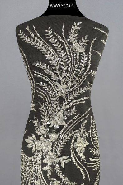 Verzierte Spitze von hoher Qualität, die sich durch originelles Muster und dekorative Details auszeichnet. Geschaffen mit dem Gedanken an anspruchsvollste Frauen, die auf eine einmalige und effektvolle Stilisierung Wert legen. Die vorgestellte Spitze wird sich als Basis einer Hochzeits- oder Abendkreation bewähren. Ihre Schönheit verdankt sie den darin enthaltenen Details. Sie spiegeln das Licht wider und erhellen den Stoff, wodurch sie zum Hingucker werden.