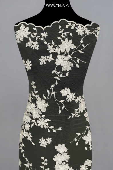 Verzierte Spitze von hoher Qualität, die sich durch originelles Muster und dekorative Details auszeichnet. Geschaffen mit dem Gedanken an anspruchsvollste Frauen, die auf eine einmalige und effektvolle Stilisierung Wert legen. Die vorgestellte Spitze wird sich als Basis einer Hochzeits- oder Abendkreation bewähren. Ihre Schönheit verdankt sie den darin enthaltenen Details. Sie spiegeln das Licht wider und erhellen den Stoff, wodurch sie zum Hingucker werden.
