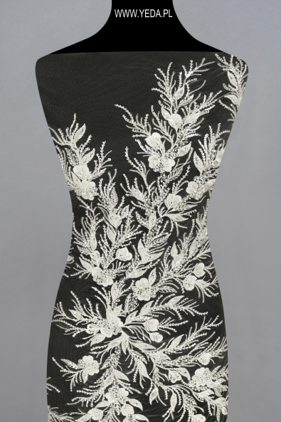Verzierte Spitze von hoher Qualität, die sich durch originelles Muster und dekorative Details auszeichnet. Geschaffen mit dem Gedanken an anspruchsvollste Frauen, die auf eine einmalige und effektvolle Stilisierung Wert legen. Die vorgestellte Spitze wird sich als Basis einer Hochzeits- oder Abendkreation bewähren. Ihre Schönheit verdankt sie den darin enthaltenen Details. Sie spiegeln das Licht wider und erhellen den Stoff, wodurch sie zum Hingucker werden.