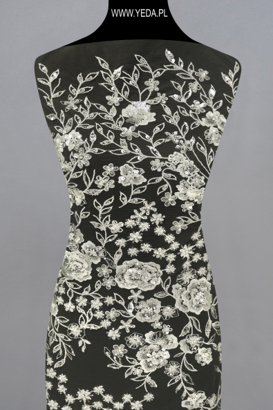 Verzierte Spitze von hoher Qualität, die sich durch originelles Muster und dekorative Details auszeichnet. Geschaffen mit dem Gedanken an anspruchsvollste Frauen, die auf eine einmalige und effektvolle Stilisierung Wert legen. Die vorgestellte Spitze wird sich als Basis einer Hochzeits- oder Abendkreation bewähren. Ihre Schönheit verdankt sie den darin enthaltenen Details. Sie spiegeln das Licht wider und erhellen den Stoff, wodurch sie zum Hingucker werden.