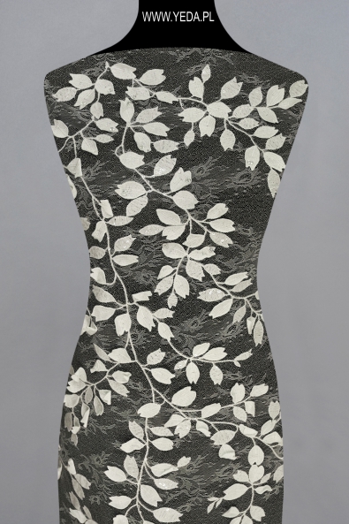 Verzierte Spitze von hoher Qualität, die sich durch originelles Muster und dekorative Details auszeichnet. Geschaffen mit dem Gedanken an anspruchsvollste Frauen, die auf eine einmalige und effektvolle Stilisierung Wert legen. Die vorgestellte Spitze wird sich als Basis einer Hochzeits- oder Abendkreation bewähren. Ihre Schönheit verdankt sie den darin enthaltenen Details. Sie spiegeln das Licht wider und erhellen den Stoff, wodurch sie zum Hingucker werden.