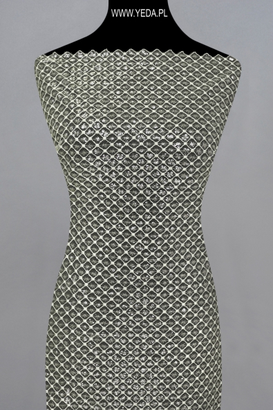 Verzierte Spitze von hoher Qualität, die sich durch originelles Muster und dekorative Details auszeichnet. Geschaffen mit dem Gedanken an anspruchsvollste Frauen, die auf eine einmalige und effektvolle Stilisierung Wert legen. Die vorgestellte Spitze wird sich als Basis einer Hochzeits- oder Abendkreation bewähren. Ihre Schönheit verdankt sie den darin enthaltenen Details. Sie spiegeln das Licht wider und erhellen den Stoff, wodurch sie zum Hingucker werden.