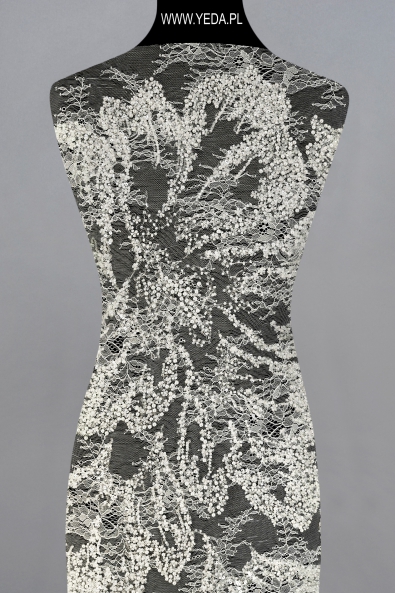 Verzierte Spitze von hoher Qualität, die sich durch originelles Muster und dekorative Details auszeichnet. Geschaffen mit dem Gedanken an anspruchsvollste Frauen, die auf eine einmalige und effektvolle Stilisierung Wert legen. Die vorgestellte Spitze wird sich als Basis einer Hochzeits- oder Abendkreation bewähren. Ihre Schönheit verdankt sie den darin enthaltenen Details. Sie spiegeln das Licht wider und erhellen den Stoff, wodurch sie zum Hingucker werden.