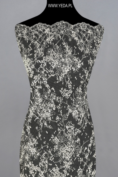 Verzierte Spitze von hoher Qualität, die sich durch originelles Muster und dekorative Details auszeichnet. Geschaffen mit dem Gedanken an anspruchsvollste Frauen, die auf eine einmalige und effektvolle Stilisierung Wert legen. Die vorgestellte Spitze wird sich als Basis einer Hochzeits- oder Abendkreation bewähren. Ihre Schönheit verdankt sie den darin enthaltenen Details. Sie spiegeln das Licht wider und erhellen den Stoff, wodurch sie zum Hingucker werden.