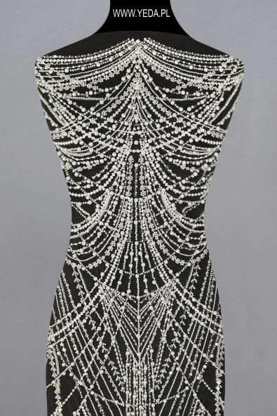 Verzierte Spitze von hoher Qualität, die sich durch originelles Muster und dekorative Details auszeichnet. Geschaffen mit dem Gedanken an anspruchsvollste Frauen, die auf eine einmalige und effektvolle Stilisierung Wert legen. Die vorgestellte Spitze wird sich als Basis einer Hochzeits- oder Abendkreation bewähren. Ihre Schönheit verdankt sie den darin enthaltenen Details. Sie spiegeln das Licht wider und erhellen den Stoff, wodurch sie zum Hingucker werden.