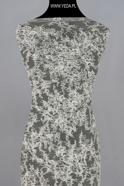 Verzierte Spitze von hoher Qualität, die sich durch originelles Muster und dekorative Details auszeichnet. Geschaffen mit dem Gedanken an anspruchsvollste Frauen, die auf eine einmalige und effektvolle Stilisierung Wert legen. Die vorgestellte Spitze wird sich als Basis einer Hochzeits- oder Abendkreation bewähren. Ihre Schönheit verdankt sie den darin enthaltenen Details. Sie spiegeln das Licht wider und erhellen den Stoff, wodurch sie zum Hingucker werden.