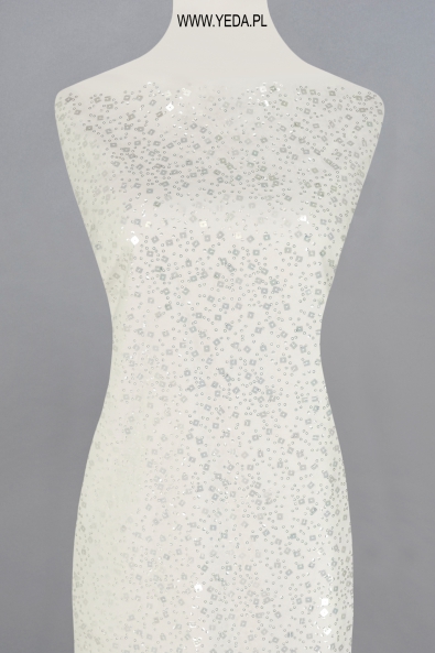Verzierte Spitze von hoher Qualität, die sich durch originelles Muster und dekorative Details auszeichnet. Geschaffen mit dem Gedanken an anspruchsvollste Frauen, die auf eine einmalige und effektvolle Stilisierung Wert legen. Die vorgestellte Spitze wird sich als Basis einer Hochzeits- oder Abendkreation bewähren. Ihre Schönheit verdankt sie den darin enthaltenen Details. Sie spiegeln das Licht wider und erhellen den Stoff, wodurch sie zum Hingucker werden.