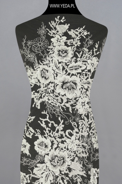 Verzierte Spitze von hoher Qualität, die sich durch originelles Muster und dekorative Details auszeichnet. Geschaffen mit dem Gedanken an anspruchsvollste Frauen, die auf eine einmalige und effektvolle Stilisierung Wert legen. Die vorgestellte Spitze wird sich als Basis einer Hochzeits- oder Abendkreation bewähren. Ihre Schönheit verdankt sie den darin enthaltenen Details. Sie spiegeln das Licht wider und erhellen den Stoff, wodurch sie zum Hingucker werden.