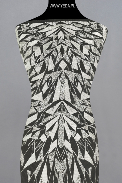 Verzierte Spitze von hoher Qualität, die sich durch originelles Muster und dekorative Details auszeichnet. Geschaffen mit dem Gedanken an anspruchsvollste Frauen, die auf eine einmalige und effektvolle Stilisierung Wert legen. Die vorgestellte Spitze wird sich als Basis einer Hochzeits- oder Abendkreation bewähren. Ihre Schönheit verdankt sie den darin enthaltenen Details. Sie spiegeln das Licht wider und erhellen den Stoff, wodurch sie zum Hingucker werden.